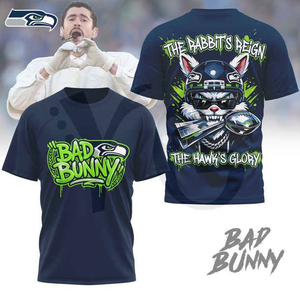 Two worlds collided in the Bay Area, and the result is pure championship gold! We designed the Bad Bunny x Seattle Seahawks Super Bowl LX Limited Edition T-Shirt to commemorate the most iconic crossover moment in sports and music history. Following the Seattle Seahawks’ dominant 29–13 victory over the Patriots and Bad Bunny’s historic halftime headlining performance—where he became the first Latin artist to sing entirely in Spanish on the world’s biggest stage—this shirt celebrates a new era of global culture.
