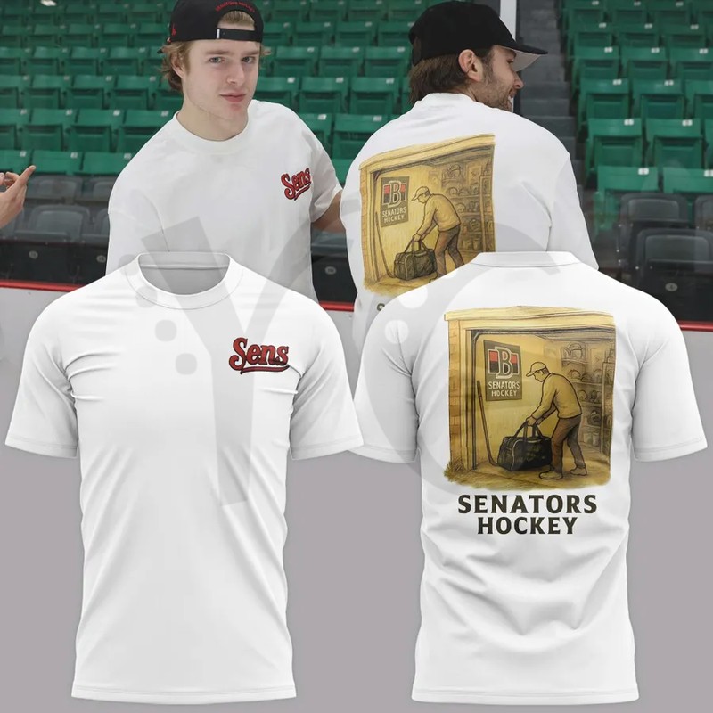 Main Graphic (“Rien à Dire” Motif): The back of the apparel features a distinctive, hand-drawn style cartoon graphic. It depicts a hockey player/staff member in a locker room, carrying a bag, with the words “SENATORS HOCKEY” below the image. This artistic illustration offers a unique, nostalgic aesthetic.