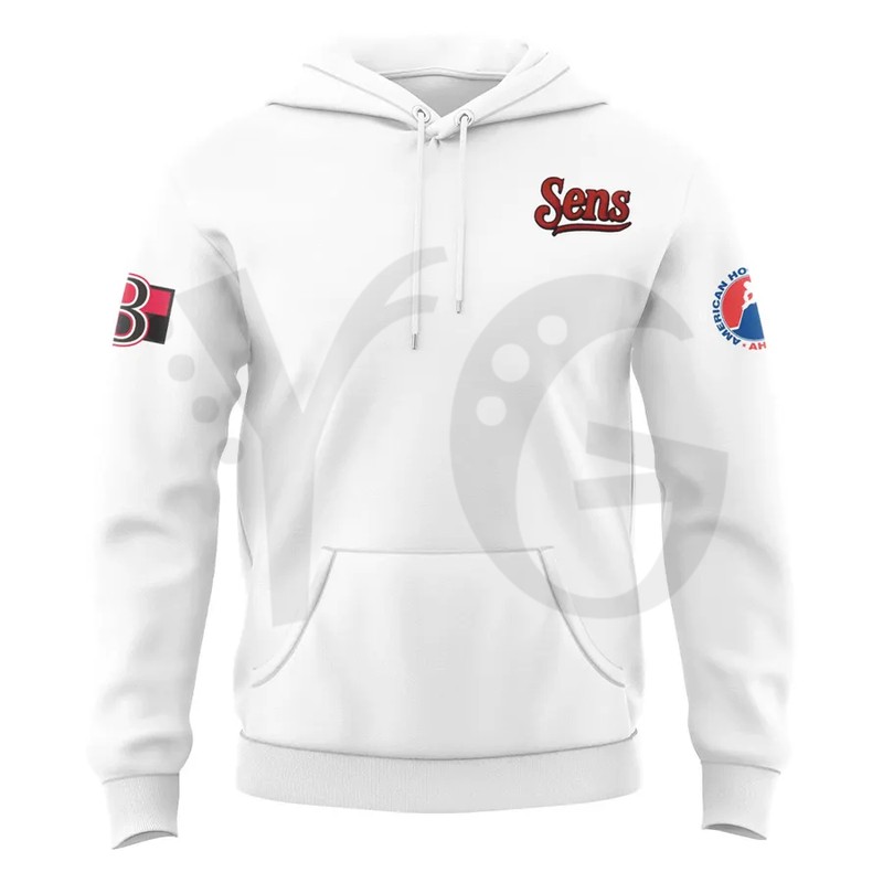 Team Accents: The front of the hoodie includes the cursive “Sens” logo on the chest and the team’s “B” emblem and an AHL patch on the sleeves.