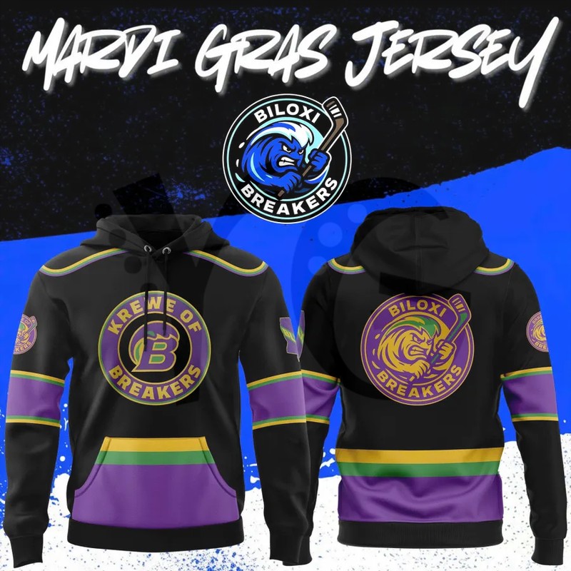 The Biloxi Breakers Mardi Gras Hoodie is a festive tribute to the soul of the Mississippi Gulf Coast. This fan-made commemorative piece blends the grit of Biloxi hockey with the historic tradition of the Carnival season, ensuring you stay warm during those chilly coastal nights without losing that “Fat Tuesday” spirit: