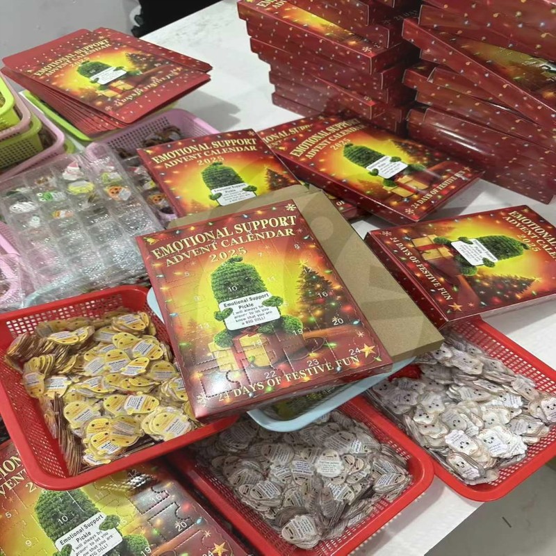 This calendar is filled with “Emotional Support” themed items, typically featuring miniature animals or whimsical creatures that offer tiny messages of encouragement. Key features and potential contents include: