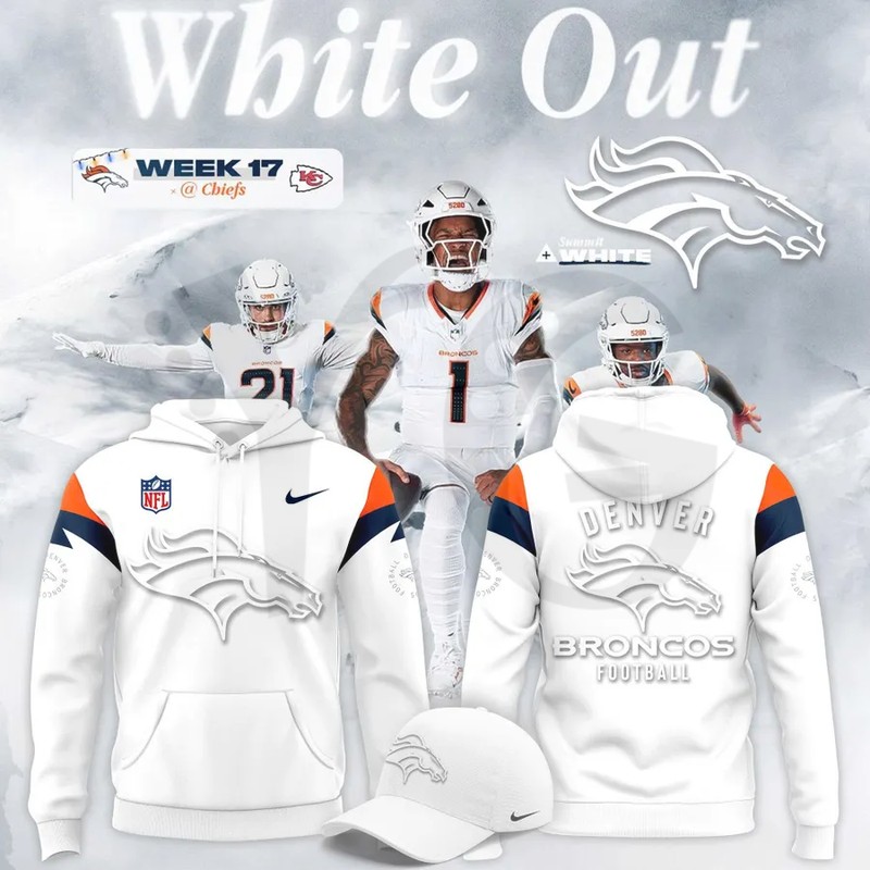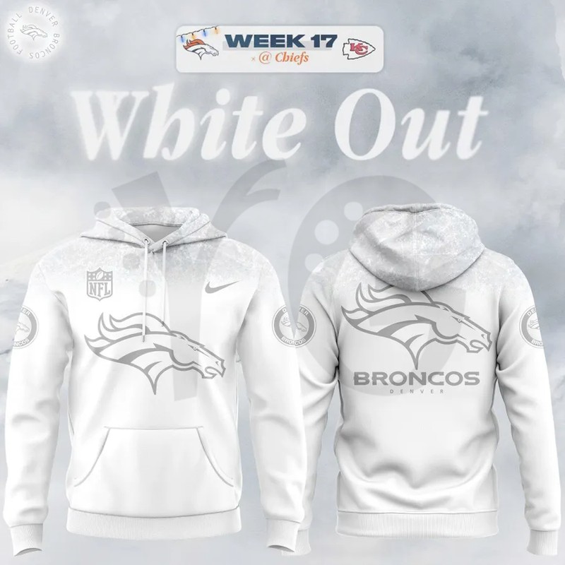 Embrace the freeze and show your pride—Order your Denver Broncos White Out Special Hoodie today!