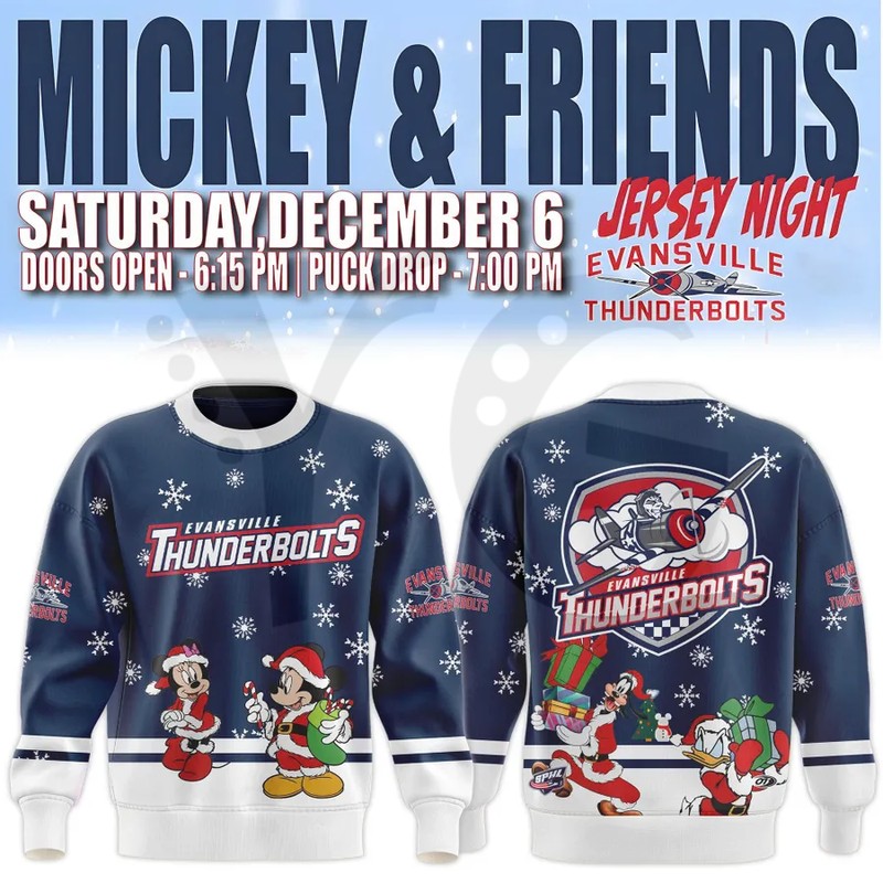 Get ready for “Jersey Night” and the holiday season with the exciting fan-made, Limited Edition Evansville Thunderbolts x Mickey Christmas Collection! This custom line of apparel is a joyful fan-created tribute, featuring Disney’s classic characters celebrating the season alongside the Thunderbolts’ spirit.