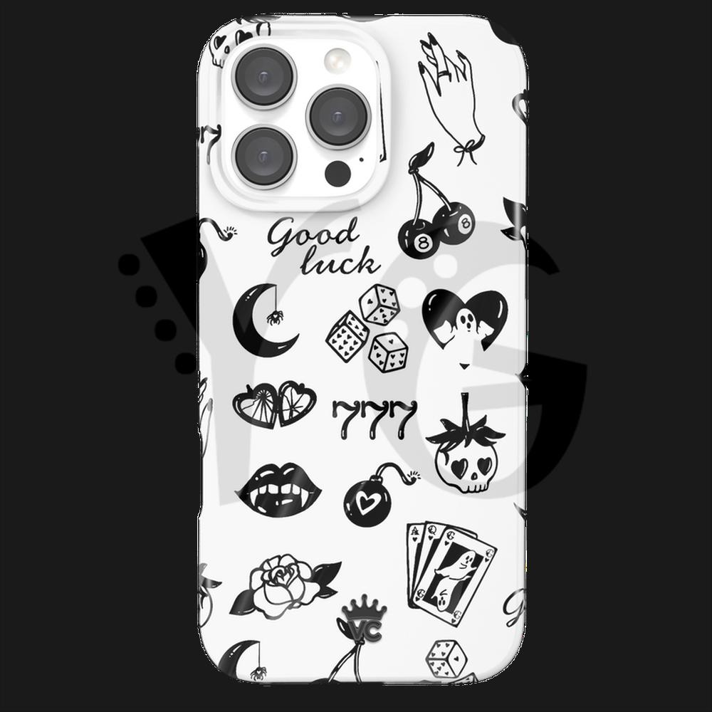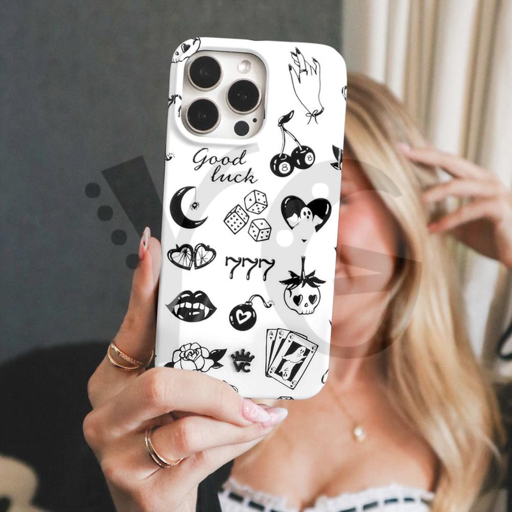 Grab your Good Luck Limited Edition Halloween Phone Case! This dual-layer case features trendy black & white tattoo-style art—from lucky 7s to cherry bombs. Limited stock! Get maximum protection and maximum luck for your phone now.