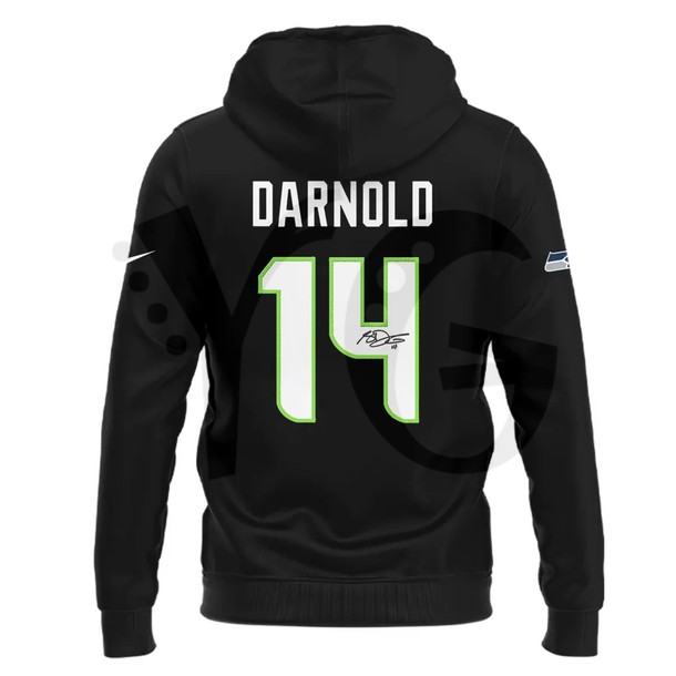 The secondary subject is the “Route to Glory” pattern found on the sleeves and interior lining. This technical graphic features ghosted imagery of the 2026 NFC Championship victory over the Rams transitioning into stylized blueprints of his touchdown pass to AJ Barner, representing the bridge between his “Seeing Ghosts” past and his “Lifting Trophies” present. The back of the apparel features the “I LOVE SAM DARNOLD” proclamation in a custom “Legacy Bold” font, designed with a shimmering gold outline. On the chest, you will find a “World Champion 2026” watermark—a high fidelity subject marking the historic “Second Ring” for Seattle.