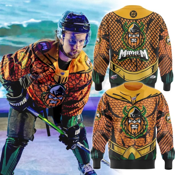 The primary subject of this apparel is the “Guardian Mayhem” crest. This specialized design features the iconic Mayhem mascot reimagined as a superhero with a 3D effect “Polished Armor” finish, set directly above the official Super Hero 2026 iconography. This subject symbolizes the bridge between modern professional hockey and the legendary, protective heritage of the guardian, rendered with the artistic precision that a milestone 2026 release deserves.