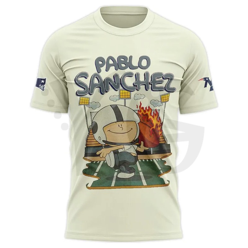 Fan-Made Crossover Design: This apparel is a fan-created tribute, not officially licensed by the NFL or the video game developer. It features imaginative designs where the iconic, tiny, helmet-wearing Pablo Sanchez is blended with the Patriots’ logo, colors (Nautical Blue, Red, and Silver), and slogans, often humorously portraying him as a secret weapon.