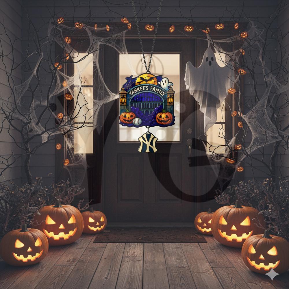 Crafted in a beautiful stained-glass style, this ornament features a classic haunted mansion gate, a couple of grinning jack-o’-lanterns, a friendly little ghost, and a few swooping bats under a full moon. The best part? It’s customized with your very own “Yankee’s Family” name right at the top, making it truly one-of-a-kind.
