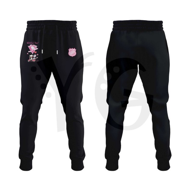 The secondary subject is the “Love Letter” pattern found on the sleeves and side panels. This technical graphic features ghosted imagery of Charlie Brown’s iconic zig zag transitioning into floating Valentine hearts and ice skate tracks. The back of the apparel features the “Pittsburgh” wordmark in a custom “Peanuts Sketch” font, designed with a soft red glow. On the chest, you will find a “Red Baron Heart” watermark—a high fidelity subject depicting Snoopy’s doghouse decorated with black and gold streamers for the holiday.