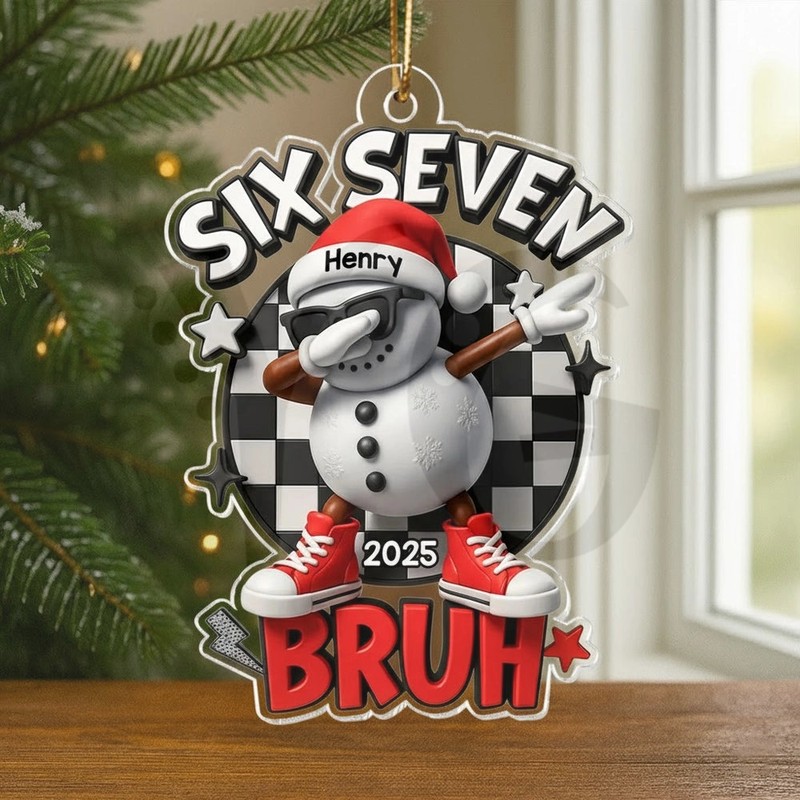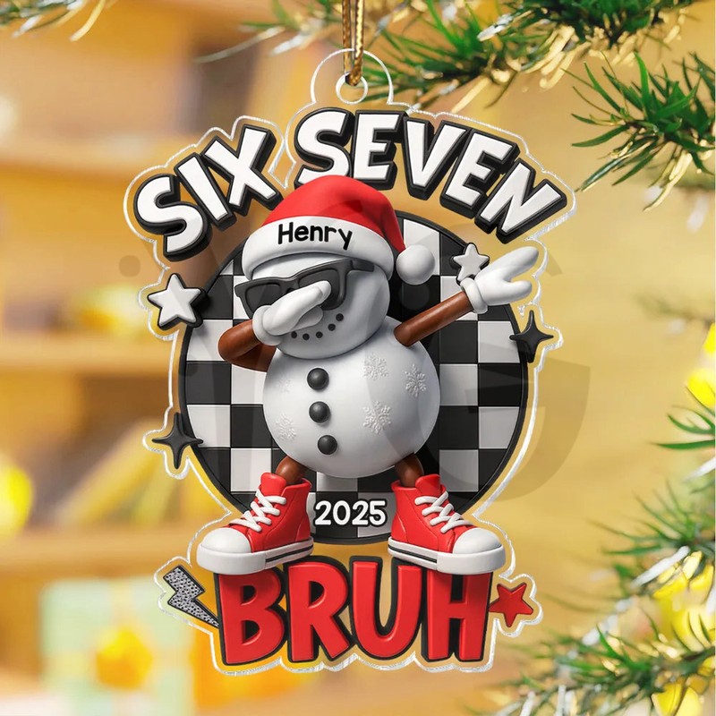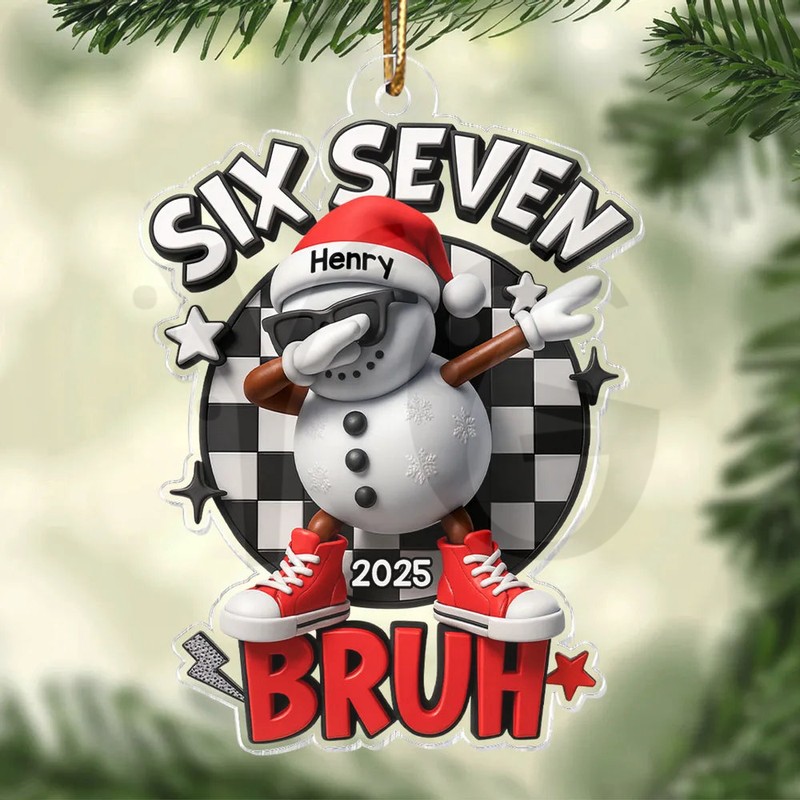 Get the viral fan-made Personalized Six Seven Bruh Snowman Ornament! A unique, funny mini acrylic ornament. Customize the Bruh Snowman now at YourGiftsy.com!