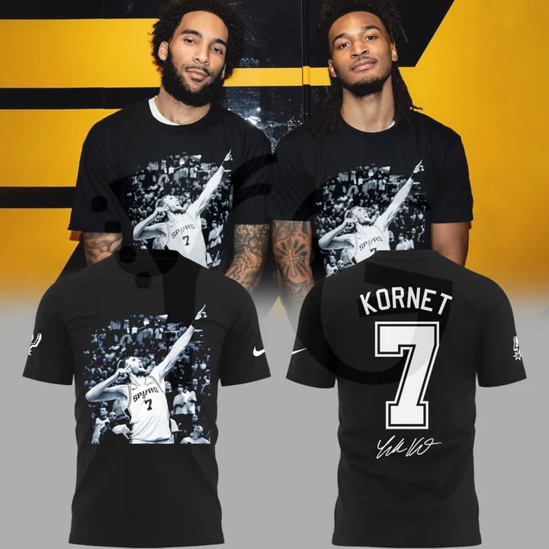 Thematic Aesthetics: Designs prominently feature Kornet’s name and number, often stylized in bold, energetic fonts, blended with the Spurs’ core colors (Black, Silver, and White). Graphics might emphasize his height, rebounding, or a memorable play.