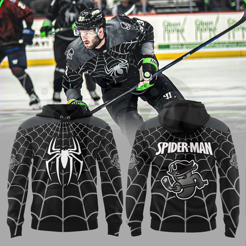 Fan-Made Crossover Design: This apparel is a fan-created tribute, not officially licensed by the ECHL or Marvel. It features imaginative designs where the classic Spider-Man suit elements (webs, red/blue colors, spider emblem) are flawlessly integrated with the Ghost Pirates’ logos and aesthetic.