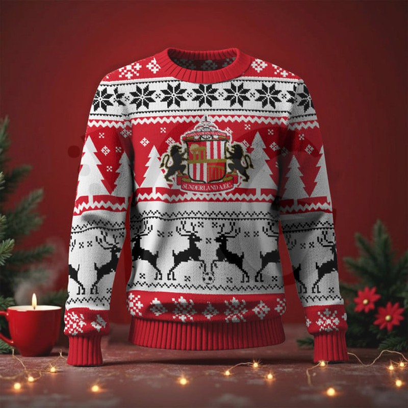 ⚫️⚪️🔴🎄 Ha’way the Lads into the holidays! Grab the Sunderland FC EPL 2025 Christmas Special Edition Ugly Sweater. Features the official crest, iconic team colors (Red & White), and festive, fun patterns. The perfect warm and bold apparel for Christmas parties or cheering on the Black Cats!